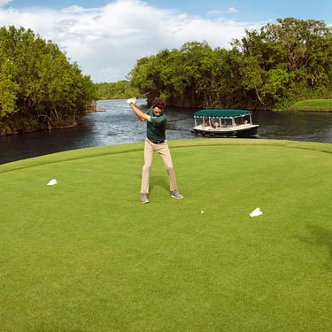 Este destino es un sueño hecho realidad para los viajeros que buscan la mezcla perfecta de deporte y naturaleza. El campo de golf El Camaleón Mayakoba, diseñado por el legendario Greg Norman, es famoso por su diseño que se integra mágicamente con la selva tropical, los manglares y los canales de agua dulce de la zona. Es un campo tan prestigioso que ha sido sede de torneos del PGA Tour.